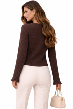 Designed in a soft sky-blue tone with delicate jacquard patterns, it features a cropped knit top paired with a matching button-down cardigan.