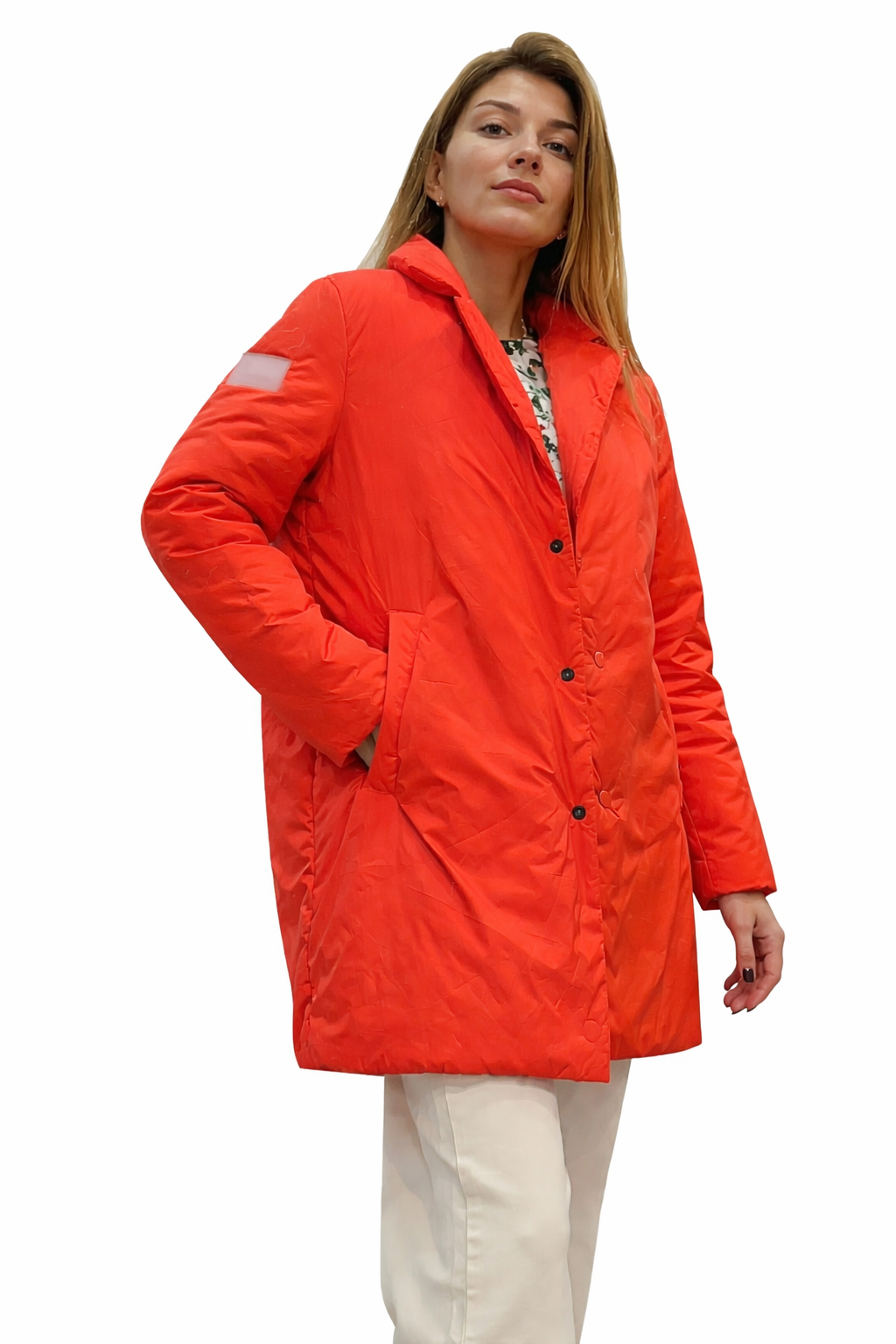 Designed for both warmth and style, it features a sleek, slightly oversized fit with a structured collar and front button closure. The lightweight padded fabric provides comfort without bulk, while the side pockets add practicality for everyday wear.
