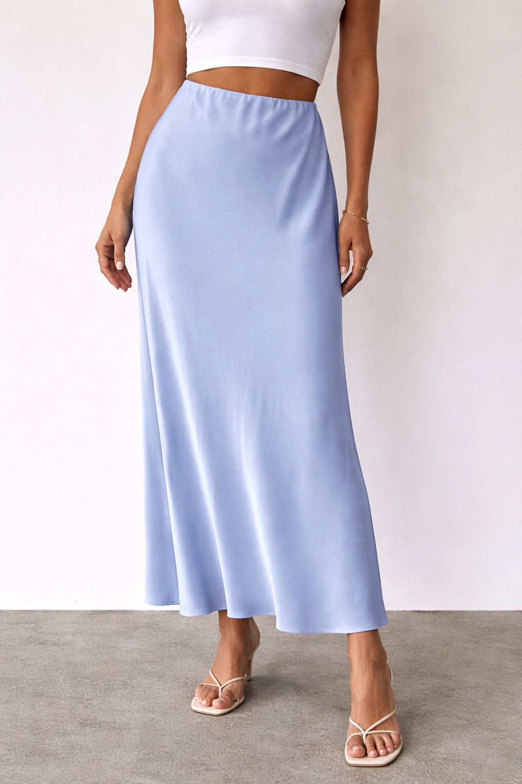 Soft baby blue satin midi skirt designed with a clean, minimal silhouette and a fluid drape.