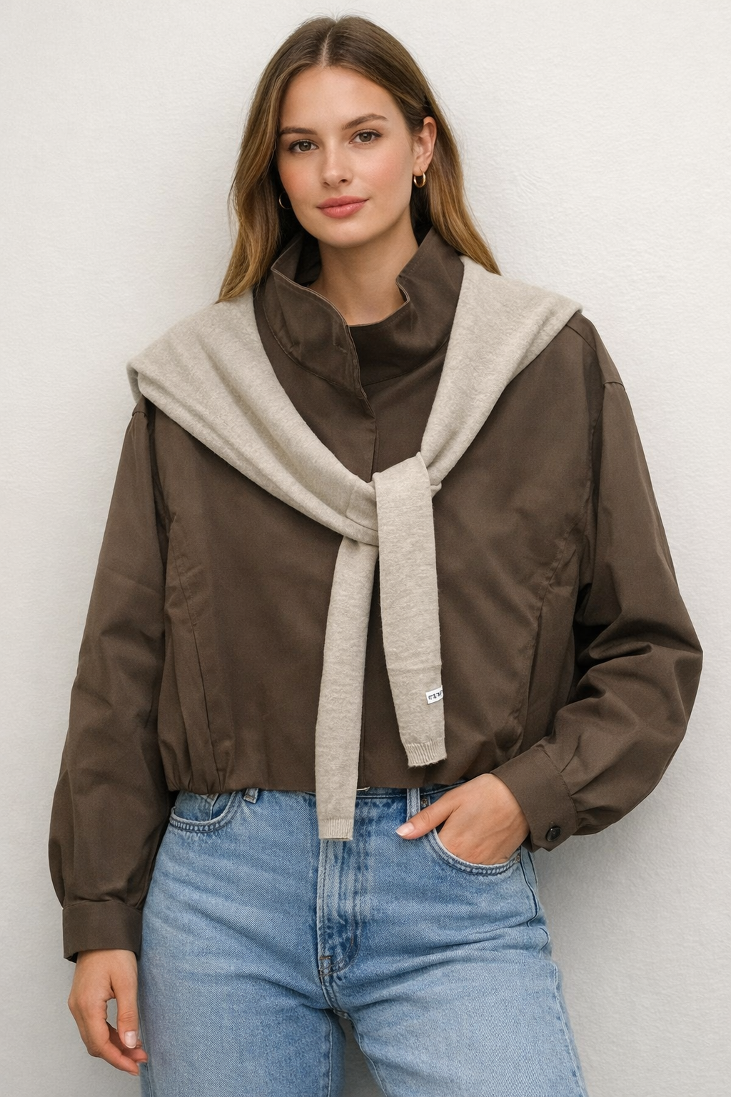 This brown cropped jacket features a structured high collar and relaxed sleeves, perfectly complemented by a soft beige knit sweater draped over the shoulders.