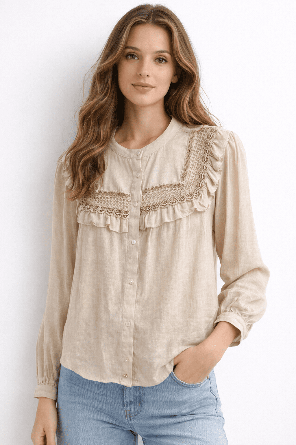 Elegant and feminine, this beige blouse features delicate lace and soft ruffle detailing across the front for a romantic, timeless look.