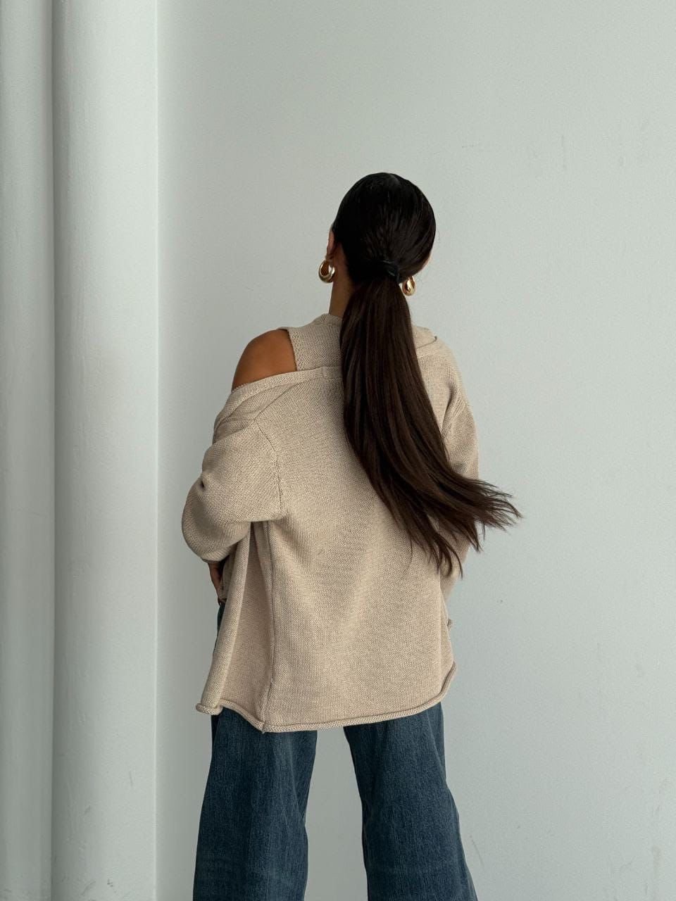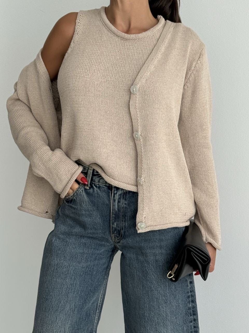 A timeless beige knit cardigan designed for effortless everyday elegance. Featuring a soft, fine-knit texture, classic round neckline, and delicate front buttons, this piece offers a flattering and comfortable fit.