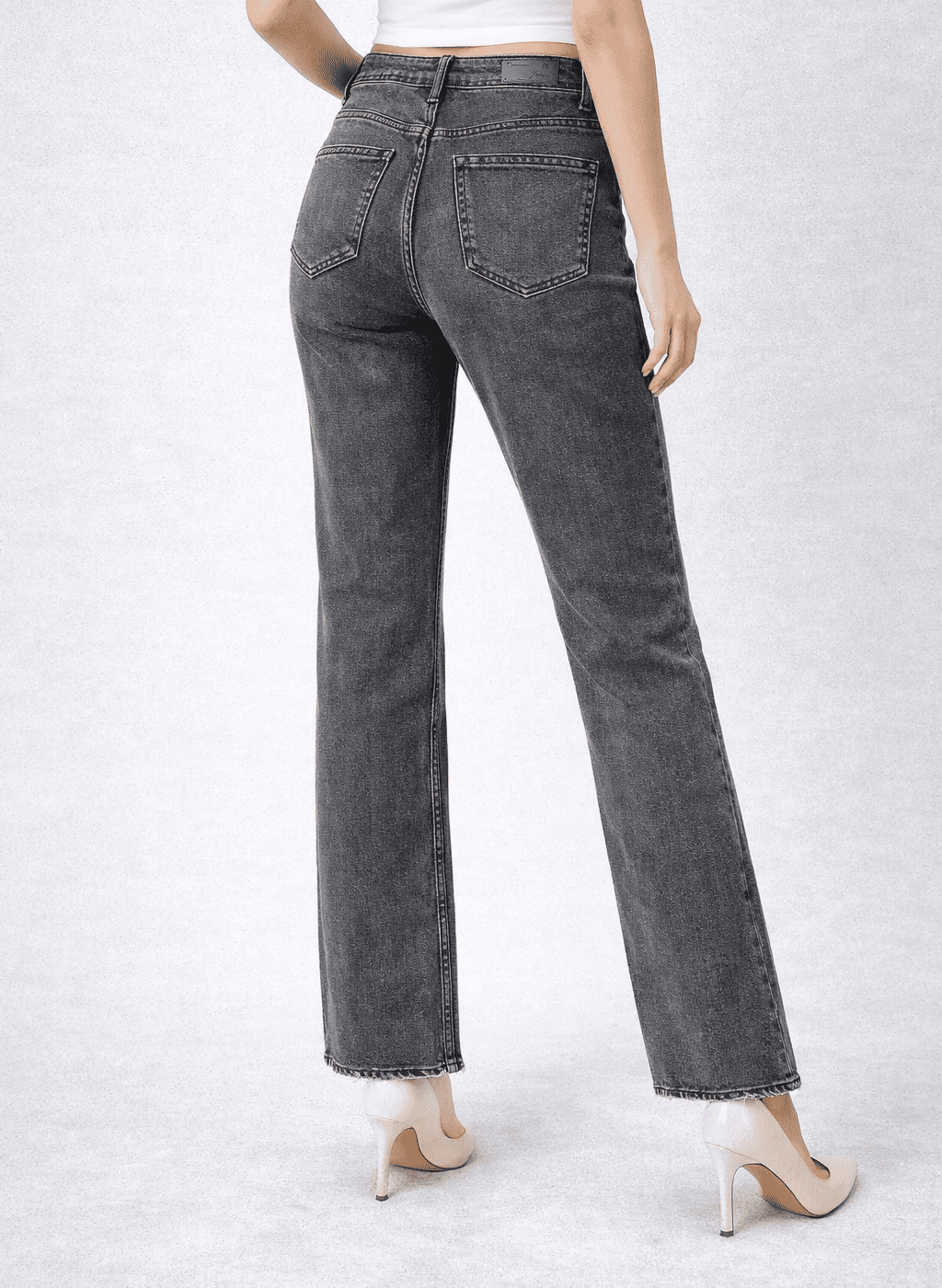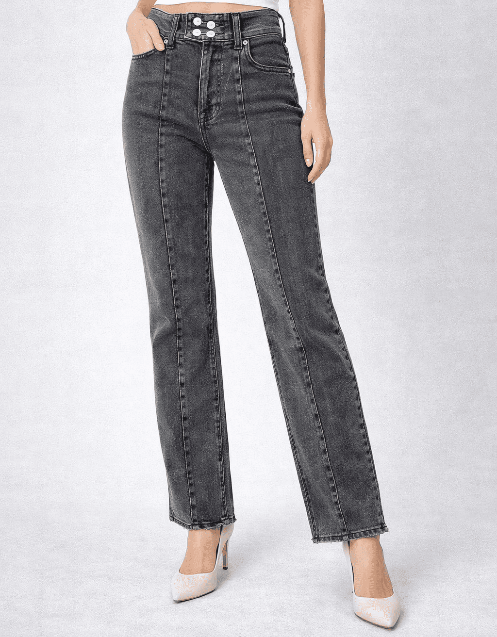 These high-waisted washed black jeans are designed to sculpt and flatter your silhouette while offering all-day comfort. The structured waistband with statement button detailing adds a chic touch, while the vertical seam lines elongate the legs for a sleek, refined look.