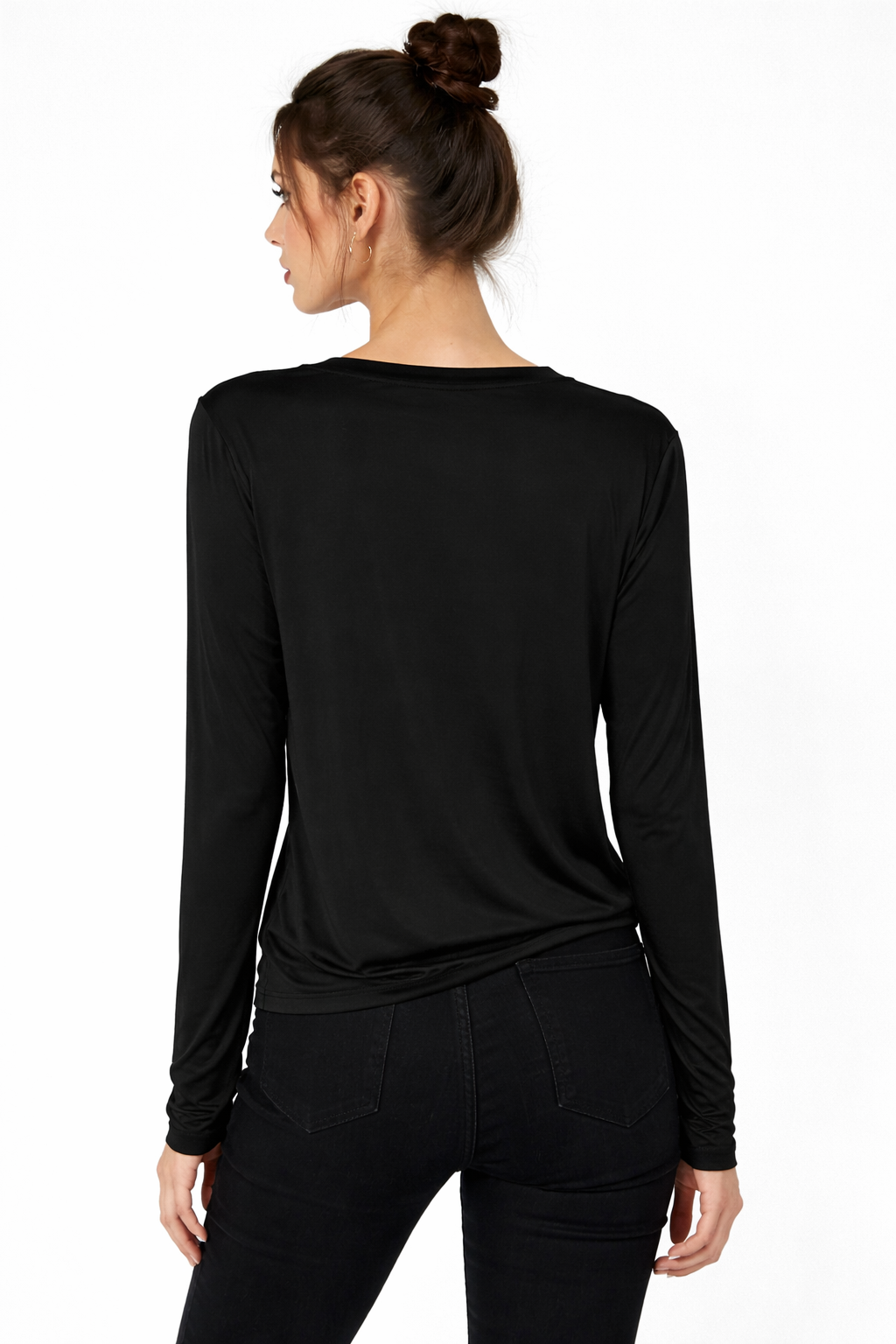 A sleek and versatile wardrobe staple, this black long-sleeve top features a soft, lightweight fabric with a smooth, slightly silky finish.