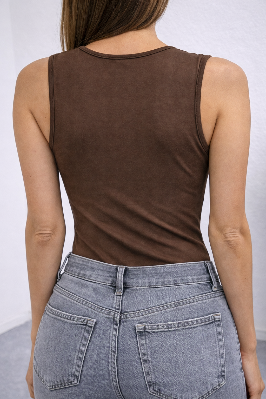 A refined statement piece designed to elevate your silhouette with modern elegance. This chocolate brown bodysuit features a sleek sleeveless cut and a unique asymmetrical draped neckline, enhanced with a gold-tone ring detail for a sophisticated touch.