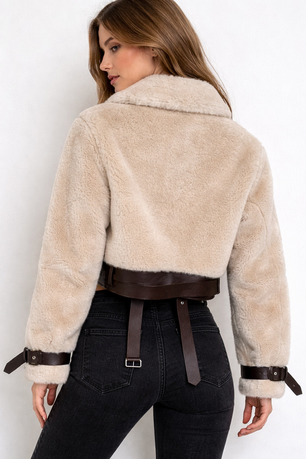 Elevate your winter wardrobe with this luxurious cropped aviator jacket, crafted from ultra-soft cream faux fur for a cozy yet statement look.
