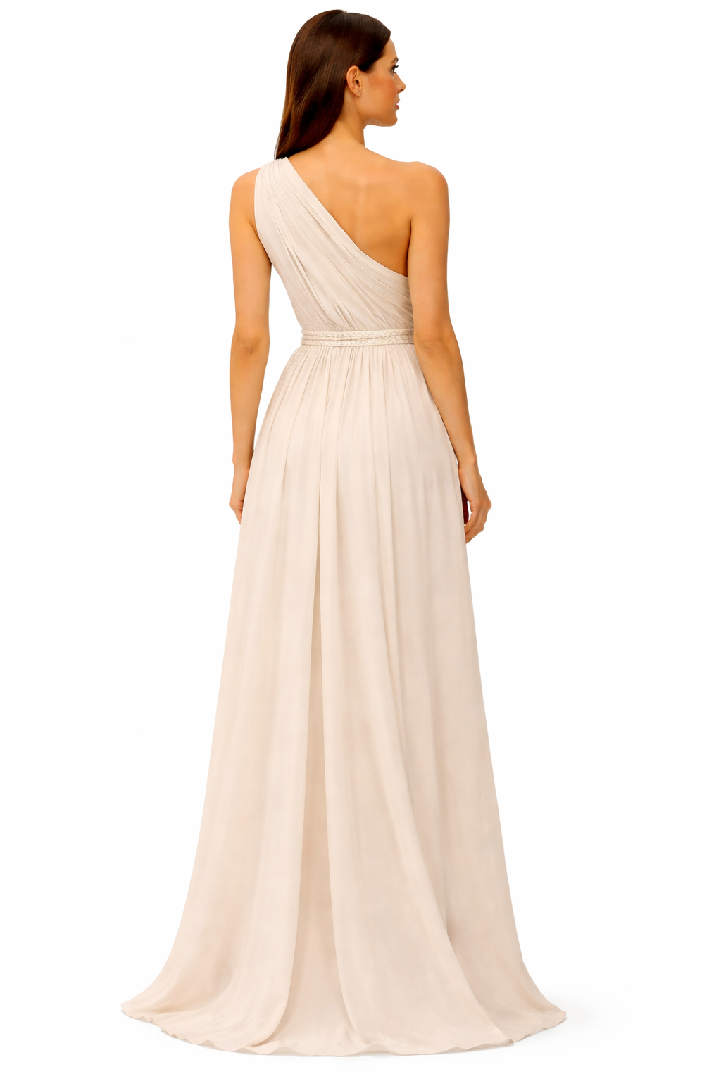 The one-shoulder design wraps smoothly across the upper back, leaving one shoulder fully exposed while the fabric drapes diagonally from the opposite shoulder.