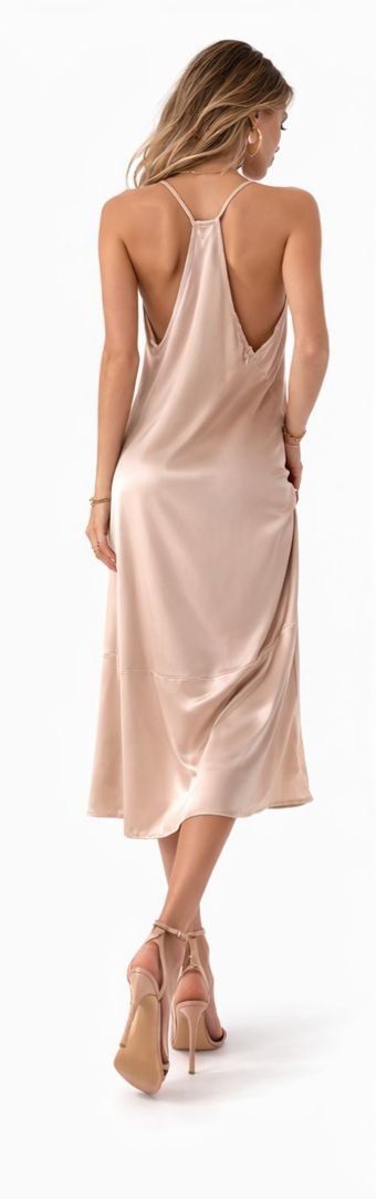 Effortlessly elegant and timeless, this champagne satin slip dress is designed to enhance your silhouette with its soft, fluid drape.