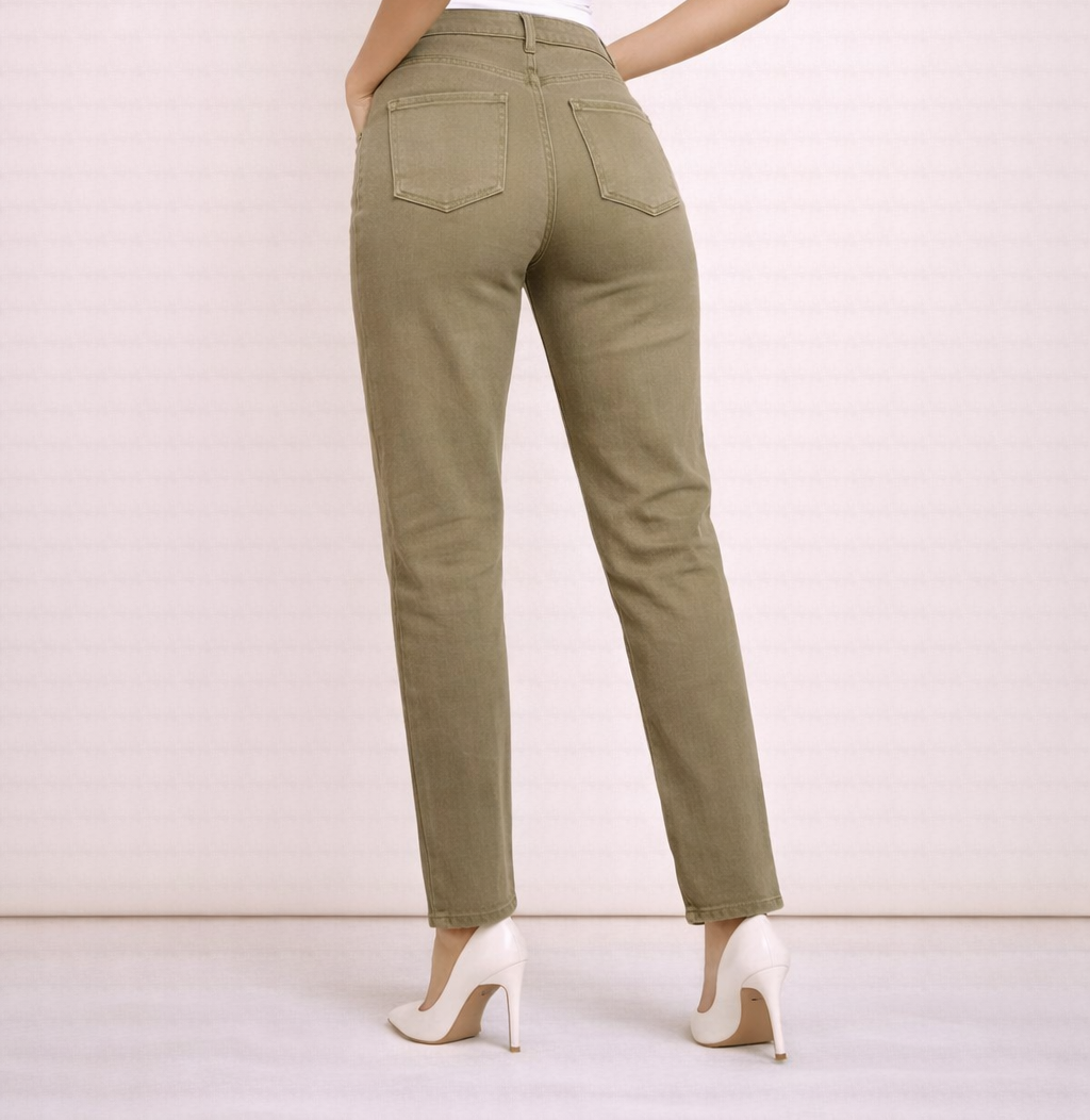 This high-waisted green jeans fits smoothly on the waist and follows the line of the body without feeling tight.