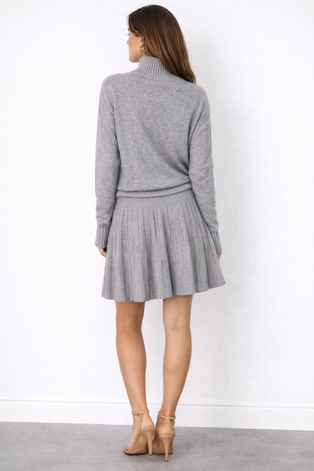 The soft turtleneck sweater features a relaxed fit with ribbed cuffs and a high neckline for a warm and stylish look. Paired with a matching pleated mini skirt, this set creates a feminine silhouette that is both comfortable and effortlessly fashionable.