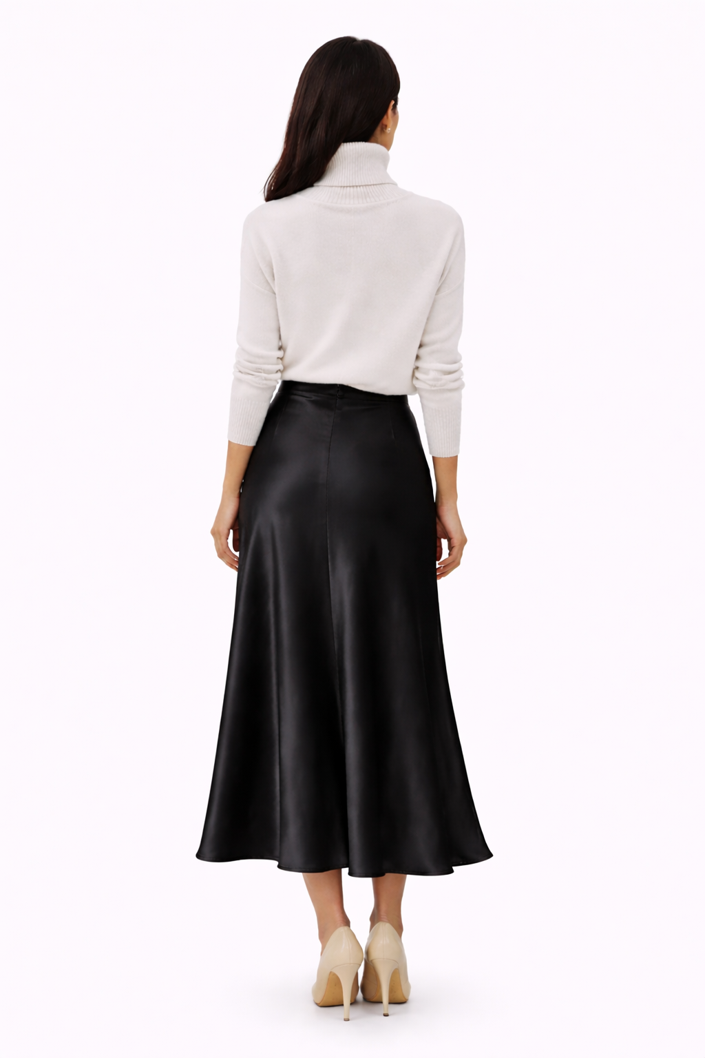 Crafted from smooth, fluid satin, it features a flattering high-waisted fit that gently skims the silhouette and falls into a graceful midi length.
