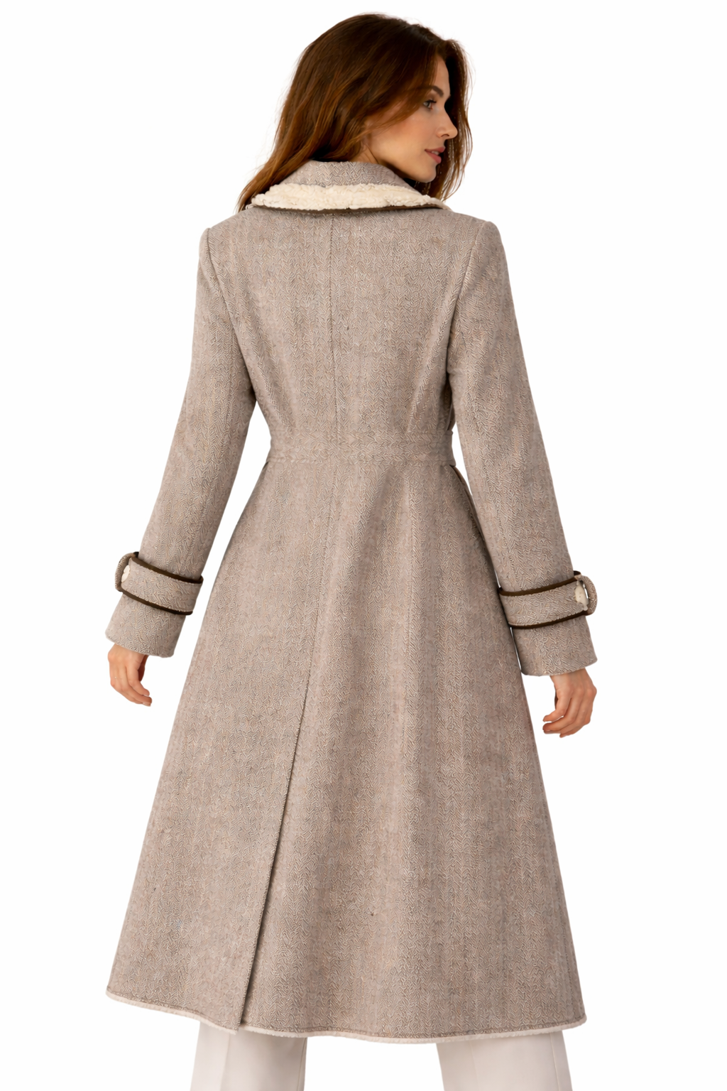 A refined outerwear piece crafted in a soft herringbone tweed, this coat blends timeless tailoring with modern sophistication.