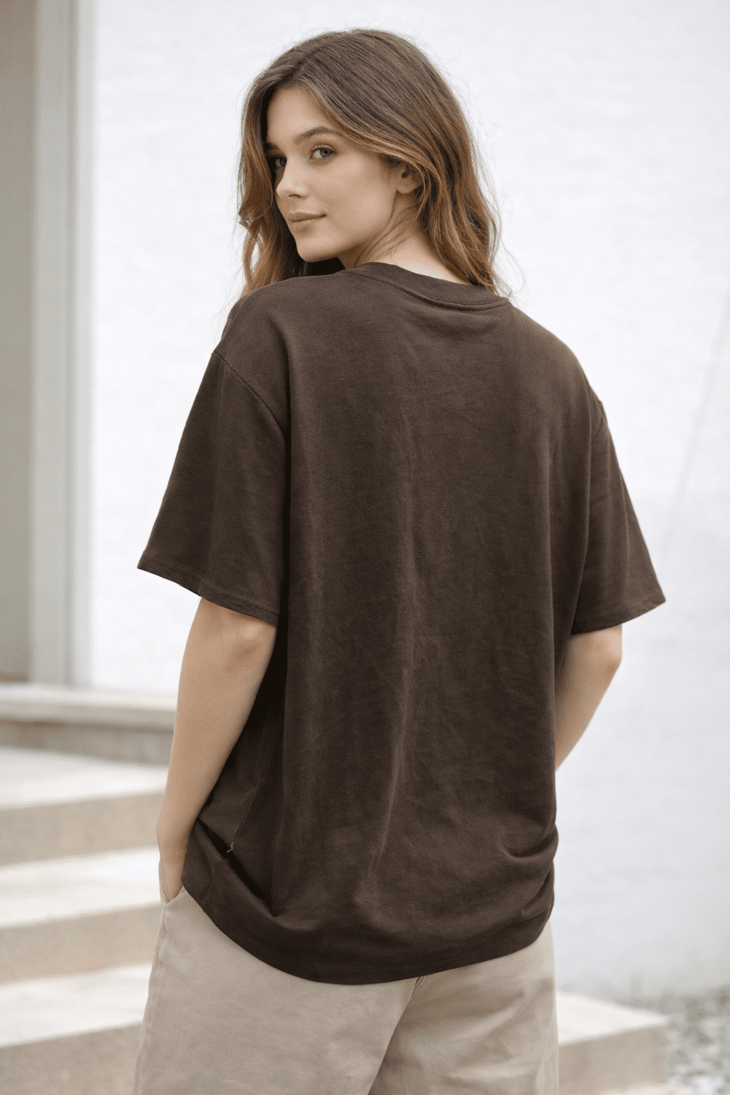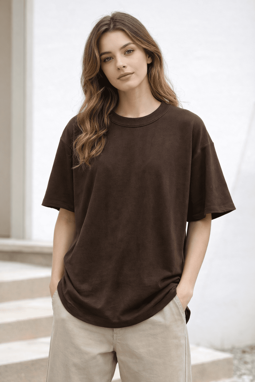 This oversized brown T-shirt features a relaxed silhouette with dropped shoulders and a classic round neckline, offering both comfort and a modern look.
