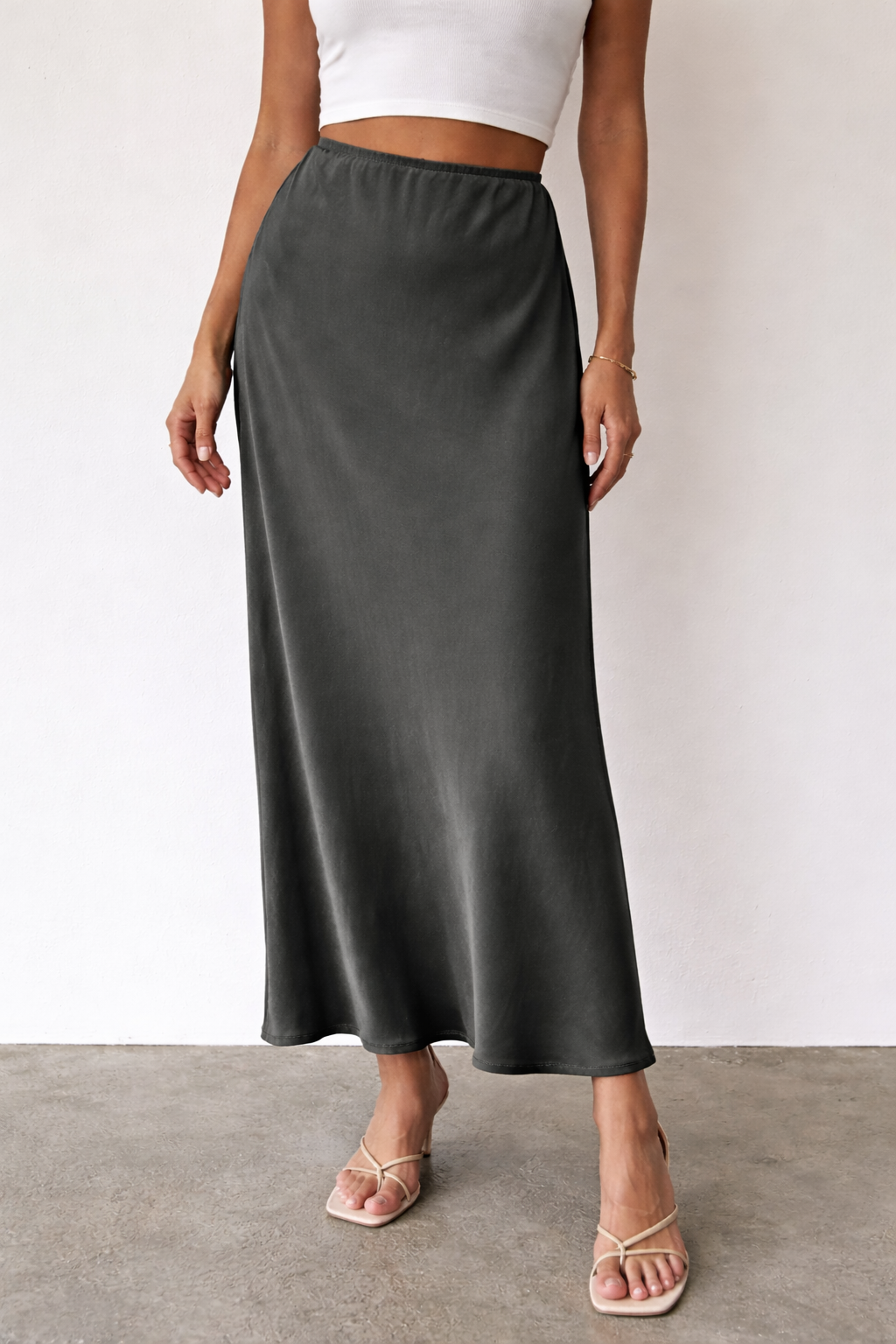 Petrol satin midi skirt designed with a smooth, fluid silhouette that softly drapes over the body