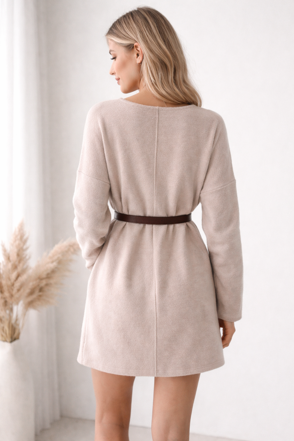 Soft, feminine, and effortlessly elegant, this beige sweater dress is designed for both comfort and style.