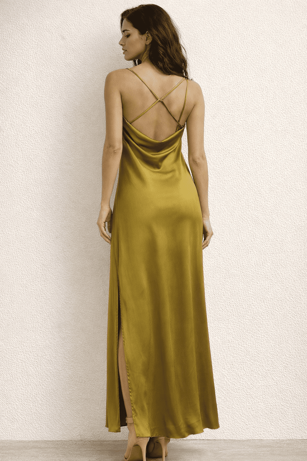 A stunning olive satin dress designed to embody elegance and modern femininity.
