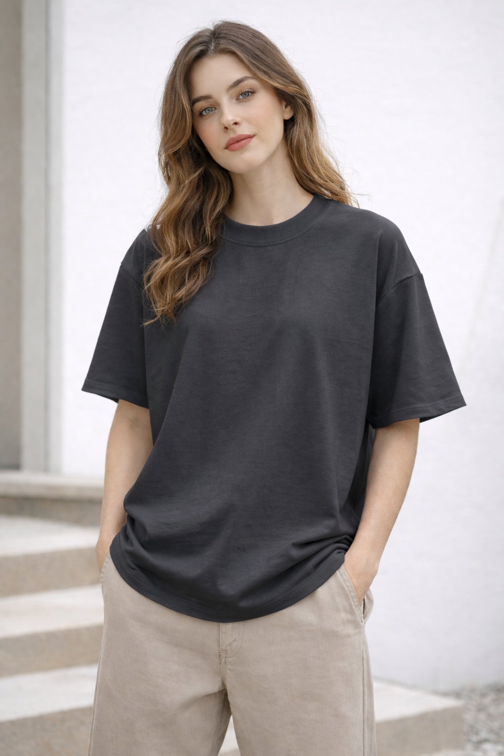 Effortlessly cool and minimal, this dark grey oversized T-shirt is a timeless essential for every wardrobe.