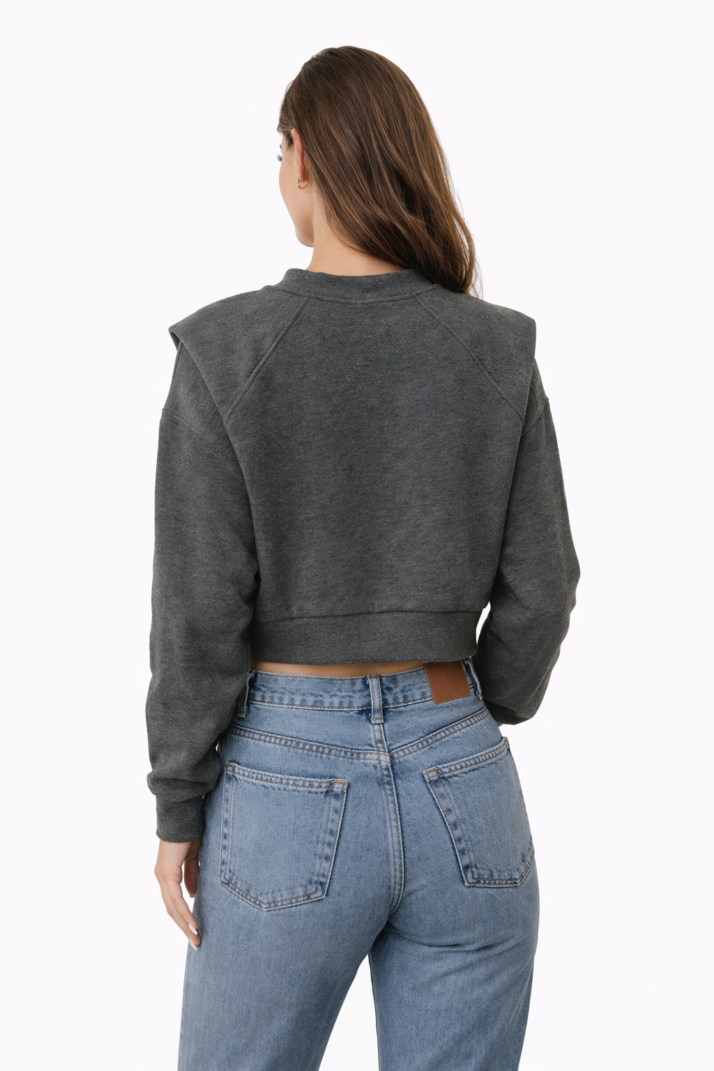 Elevate your everyday style with this modern charcoal cropped sweatshirt, designed with a structured shoulder detail for a bold, fashion-forward look.