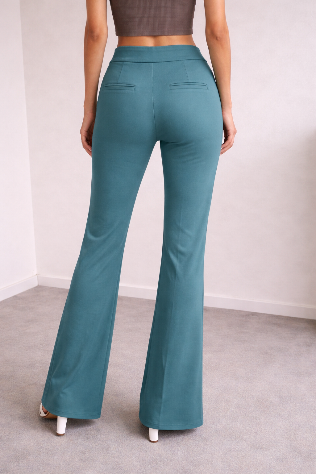 Designed to flatter and elongate the silhouette, these teal flared pants are the perfect blend of elegance and comfort. Featuring a high-waisted fit and a sleek, body-contouring design, they gently flare from the knee down, creating a feminine and sophisticated shape.