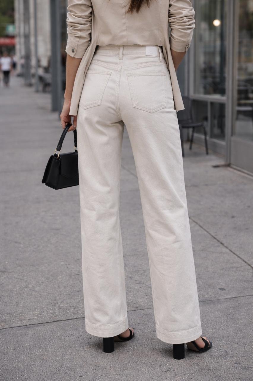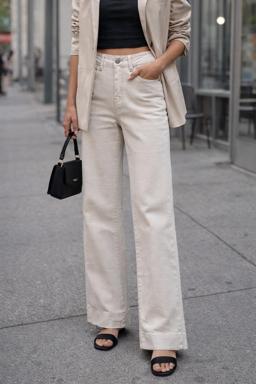Wide-leg high-waist jeans in a soft off-white shade, designed with a clean straight silhouette that enhances the waist and creates a long, elegant leg line.