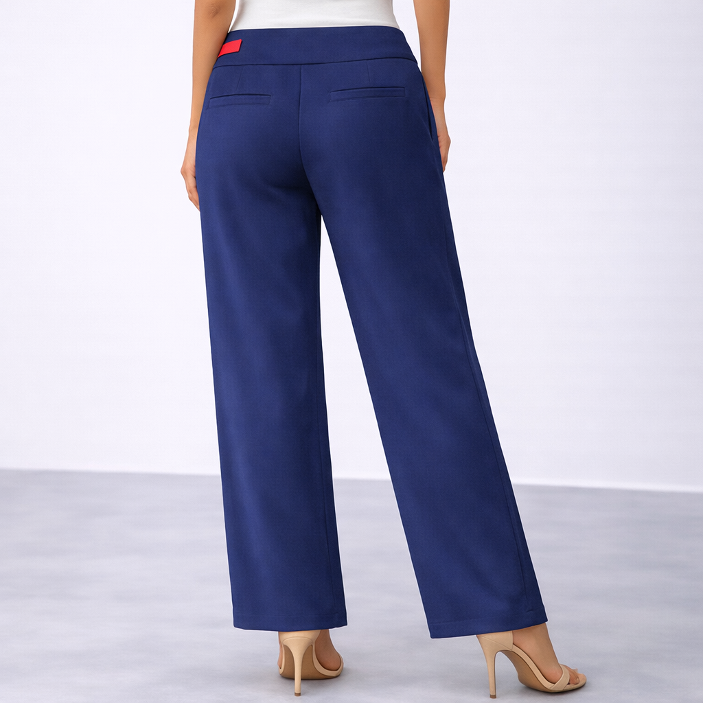 Chic and timeless, these navy blue pants feature a flattering high-waist design and a sleek straight-leg cut that elongates the silhouette. Finished with refined tailoring, back welt pockets, and a subtle signature detail on the waistband, they offer both comfort and sophistication.