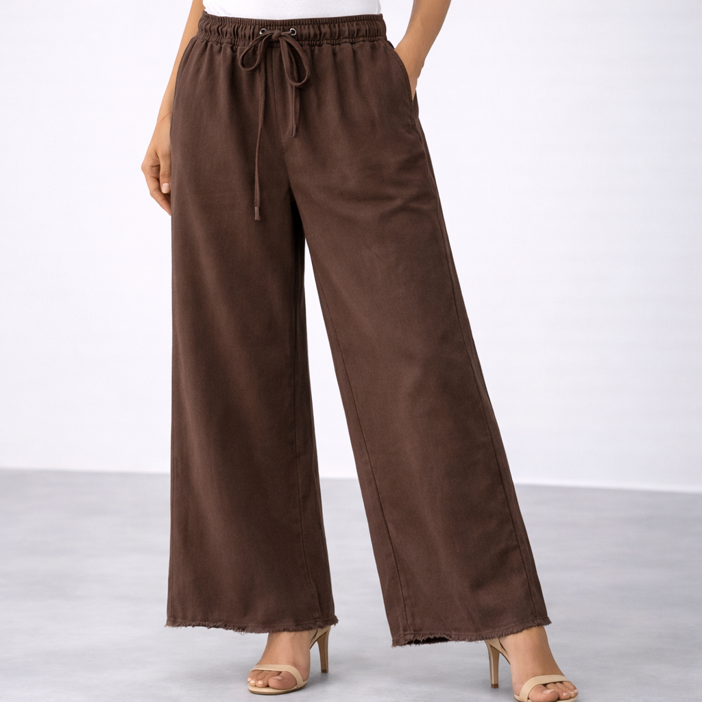 This brown wide-leg pant features a clean and flattering back silhouette with a soft elastic waistband that offers both comfort and a perfect fit.