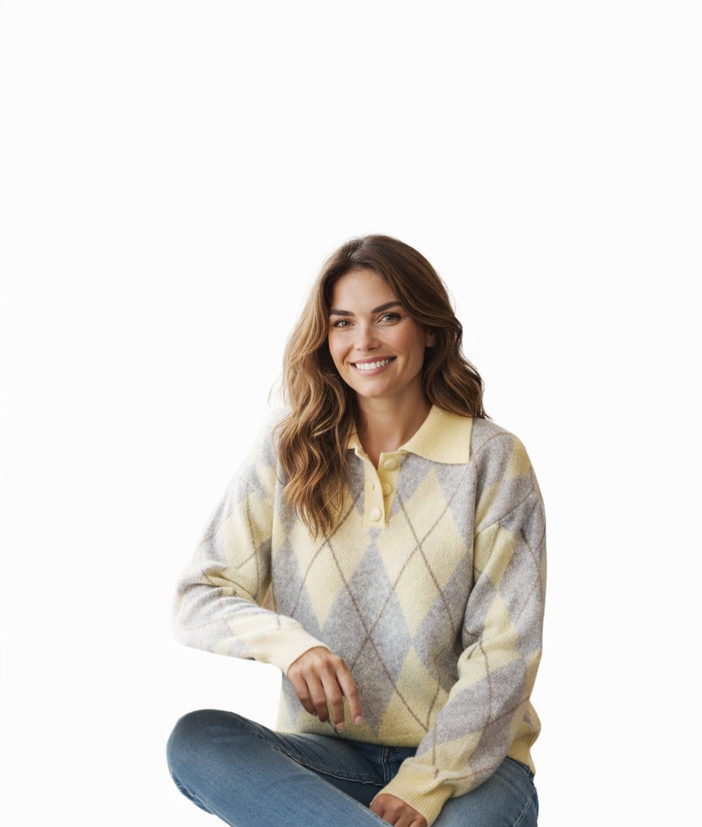 Add a soft and elegant touch to your casual wardrobe with this argyle knit sweater.