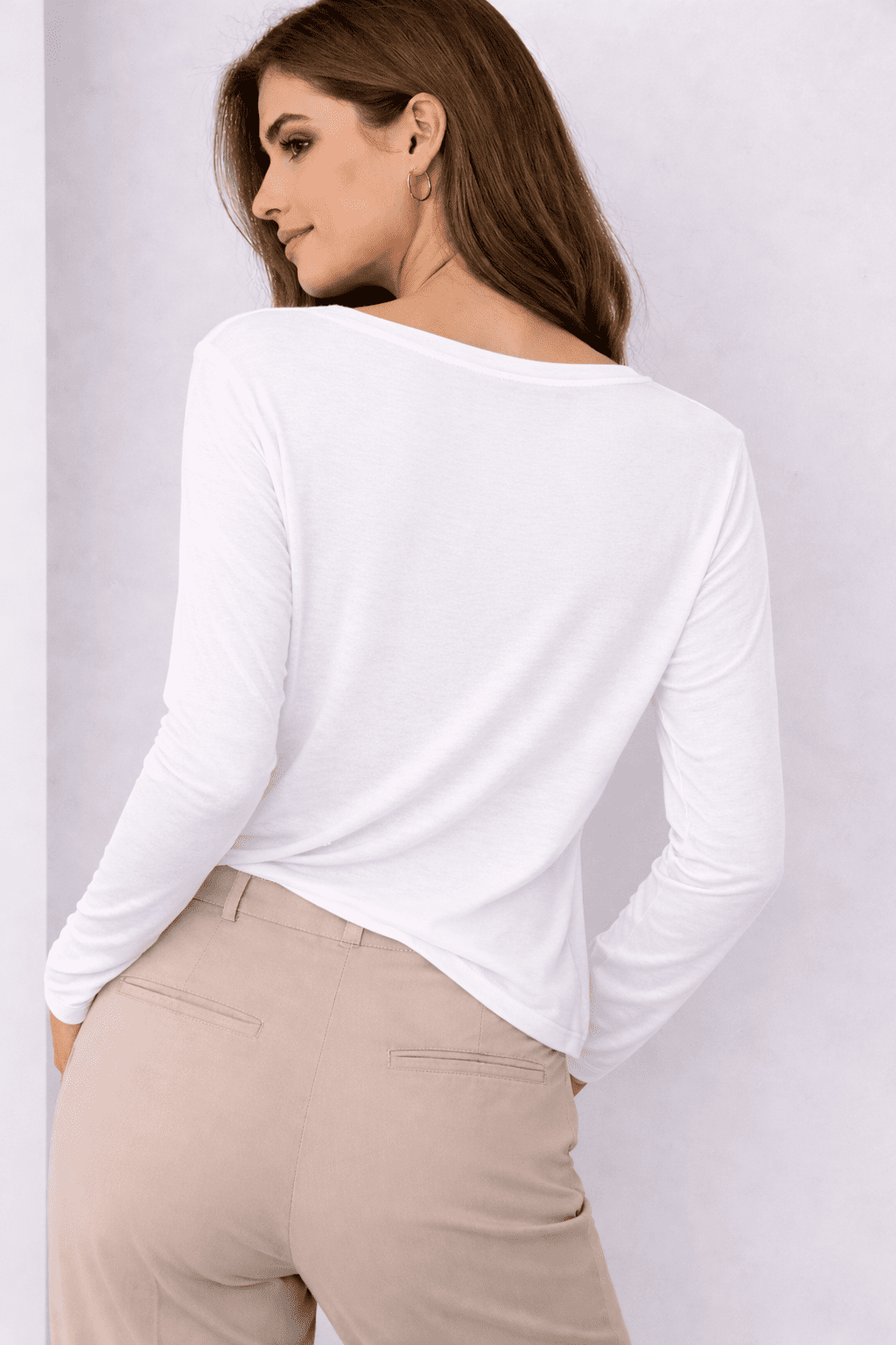This white long sleeve top is crafted from a soft, lightweight fabric that feels smooth on the skin and offers a beautiful natural drape.