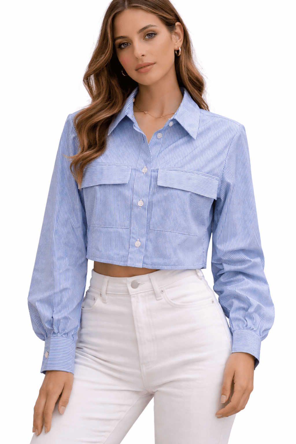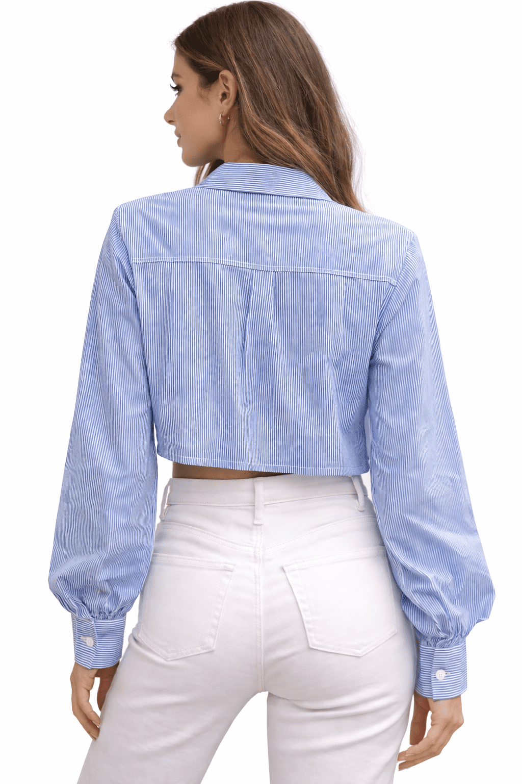 This chic cropped shirt features a fresh blue-and-white vertical stripe pattern that gives it a crisp, modern look.