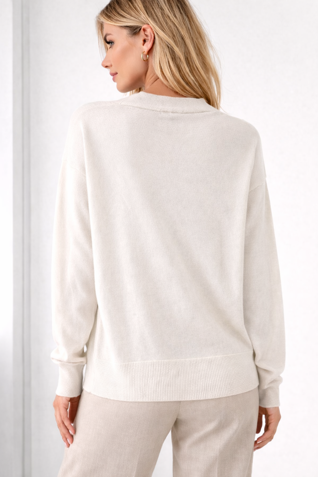 This soft knit cardigan features a relaxed fit, a flattering V-neckline, and delicate front buttons for a refined look.