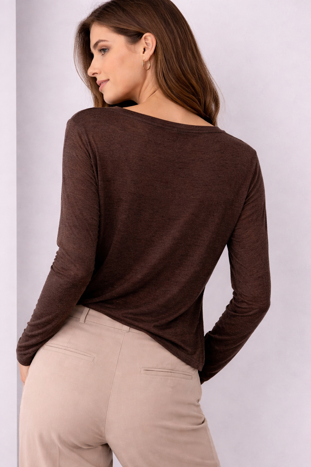 An essential piece with a refined touch, this chocolate brown long sleeve top is crafted from a lightweight, soft, and slightly sheer fabric that drapes beautifully on the body.