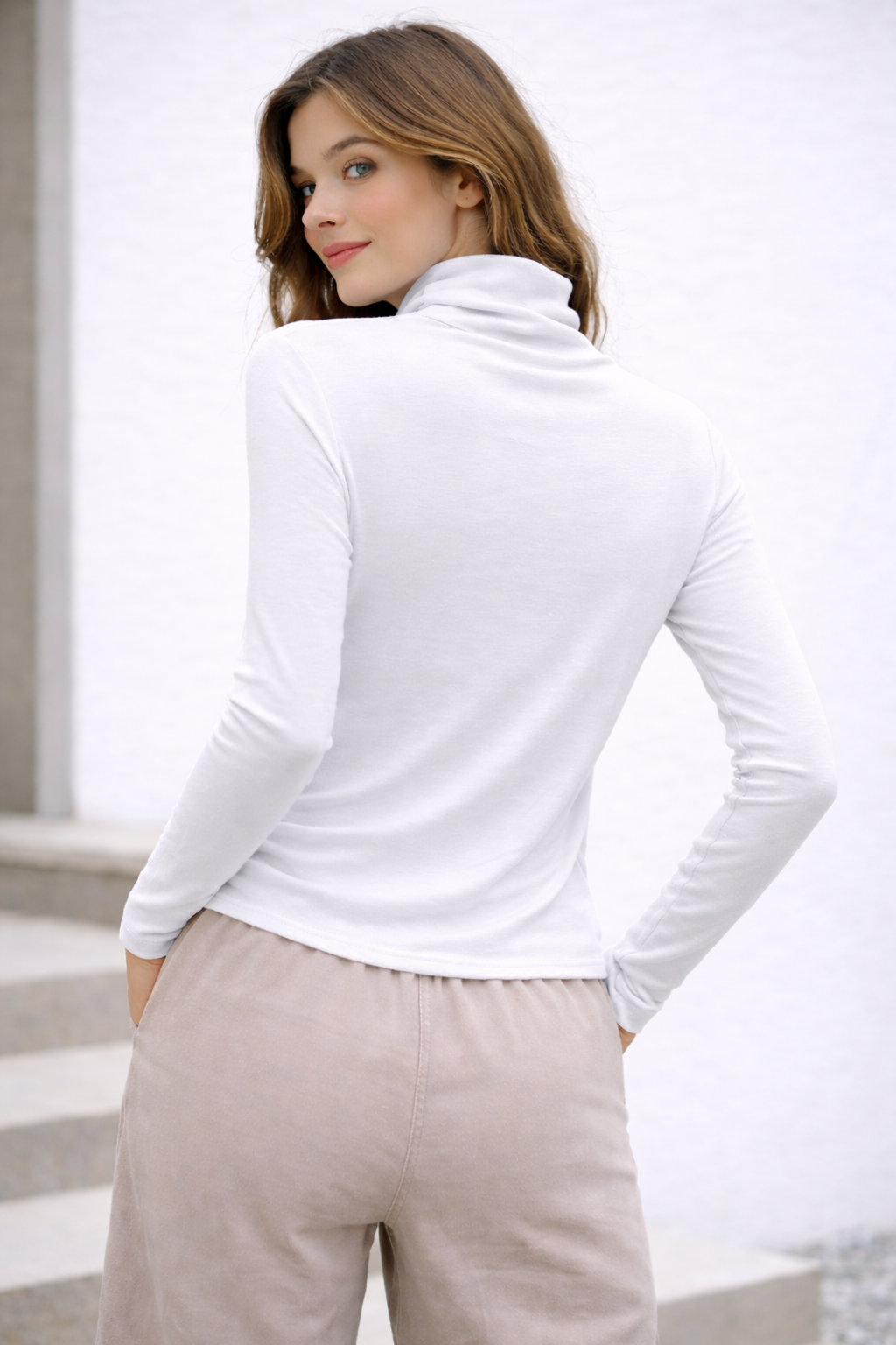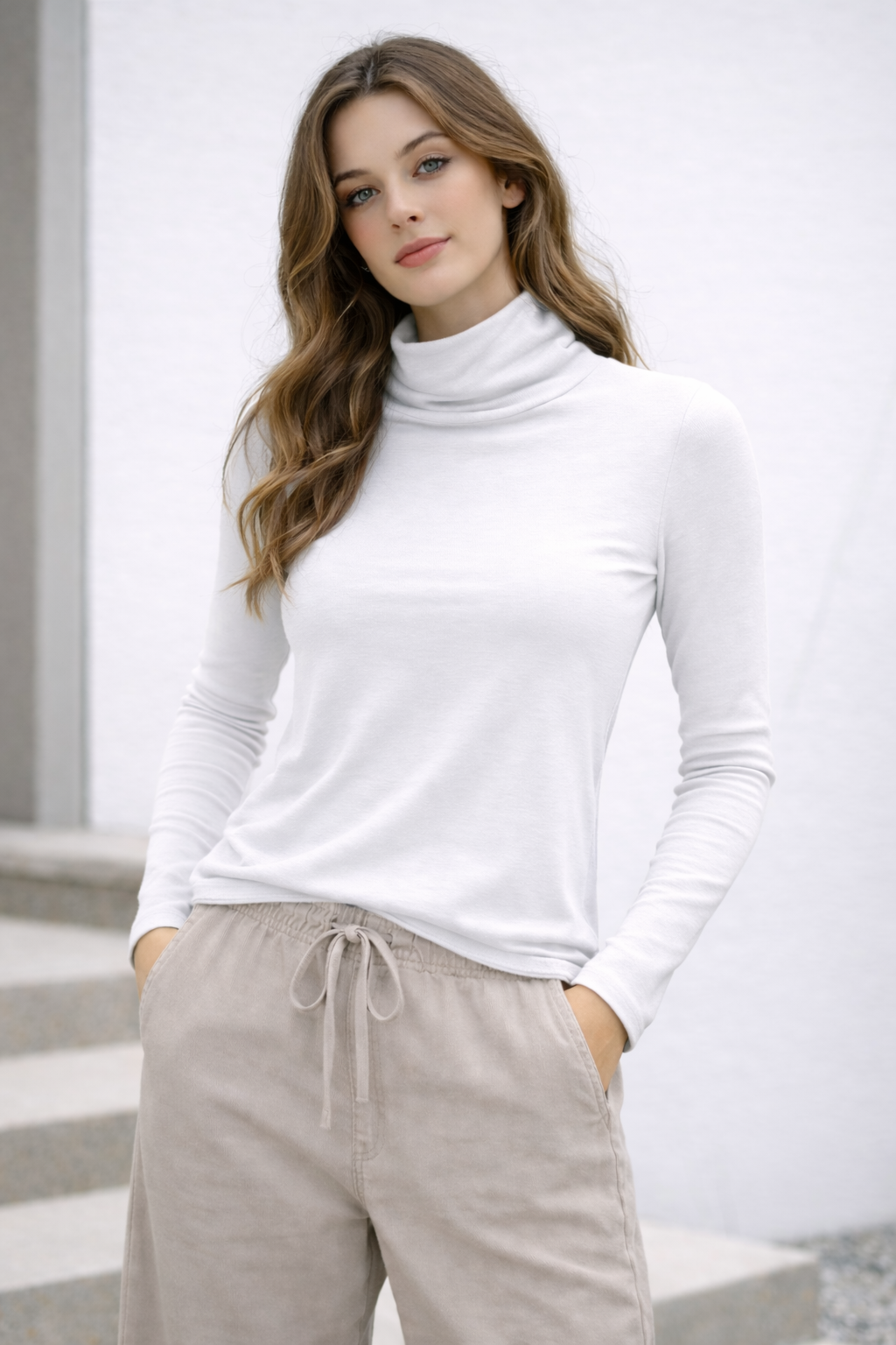 This white turtleneck features a soft, lightweight fabric that gently hugs the body, creating a flattering slim silhouette.