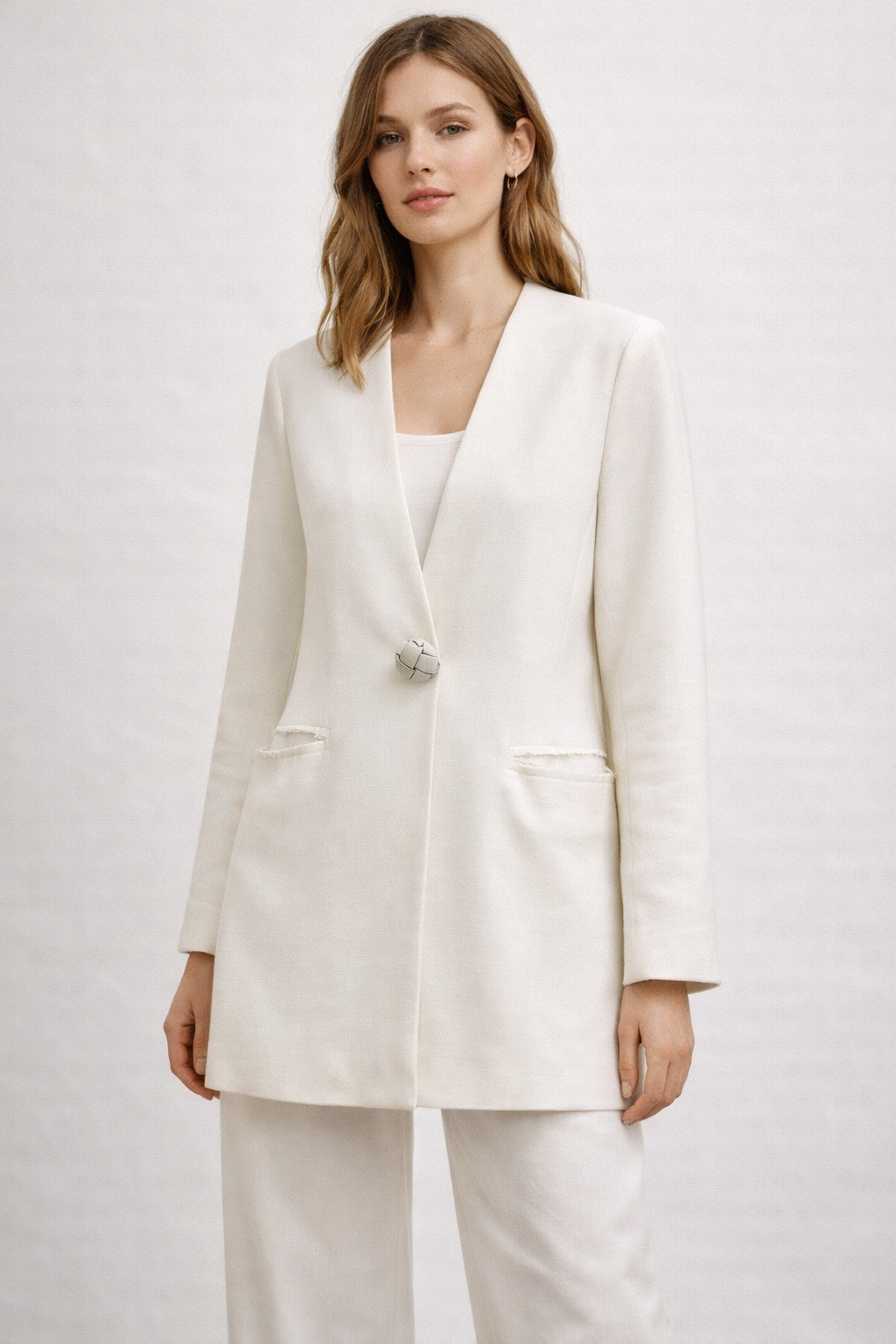 A refined white blazer designed with a clean V-neck cut and a minimalist silhouette. Featuring a unique statement button and subtle raw-edge pocket details, this piece blends modern style with timeless elegance.
