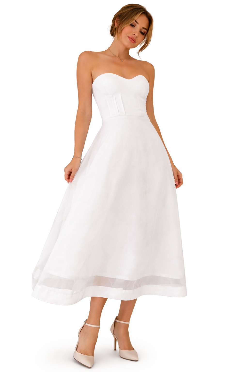 he dress has a structured bodice with a soft sweetheart neckline and subtle vertical paneling that enhances the silhouette, while the skirt flows gracefully with a light, semi-sheer overlay adding movement and softness.