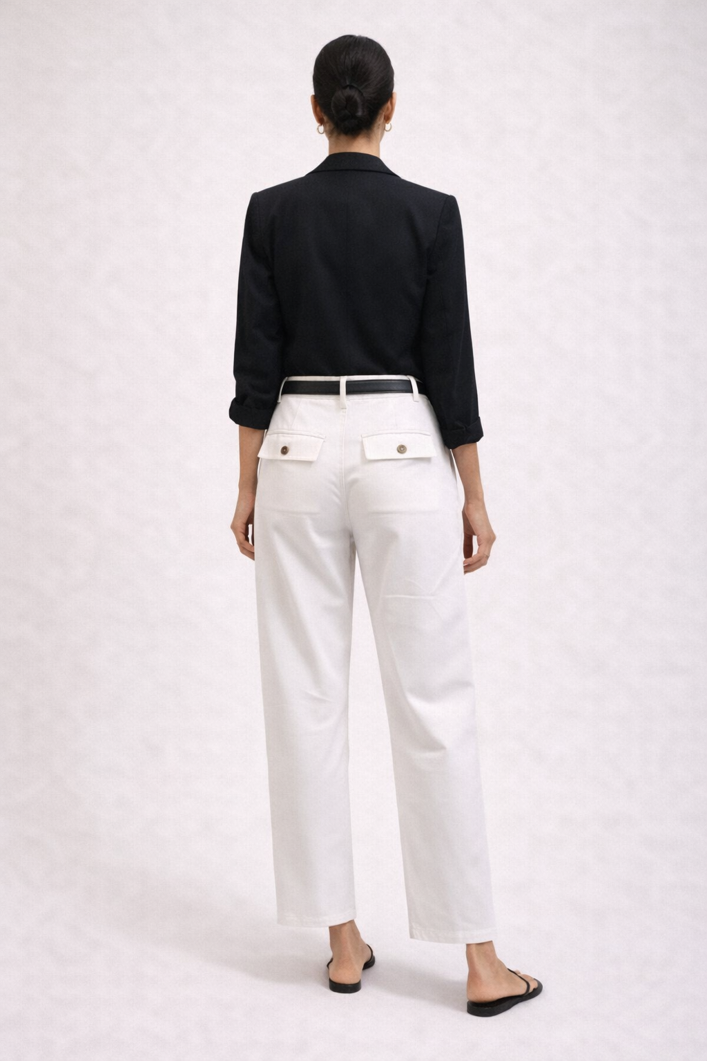 Elegant and versatile white pants designed with a flattering high waist and a relaxed straight-leg silhouette. Featuring refined back flap pockets with button details and a smooth tailored finish, these pants combine comfort with a polished look.