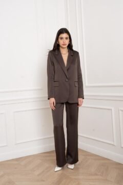 Luxurious 100% Cupro satin co-ord set with a tailored blazer and wide-leg pants. Silky, breathable, and elegant.